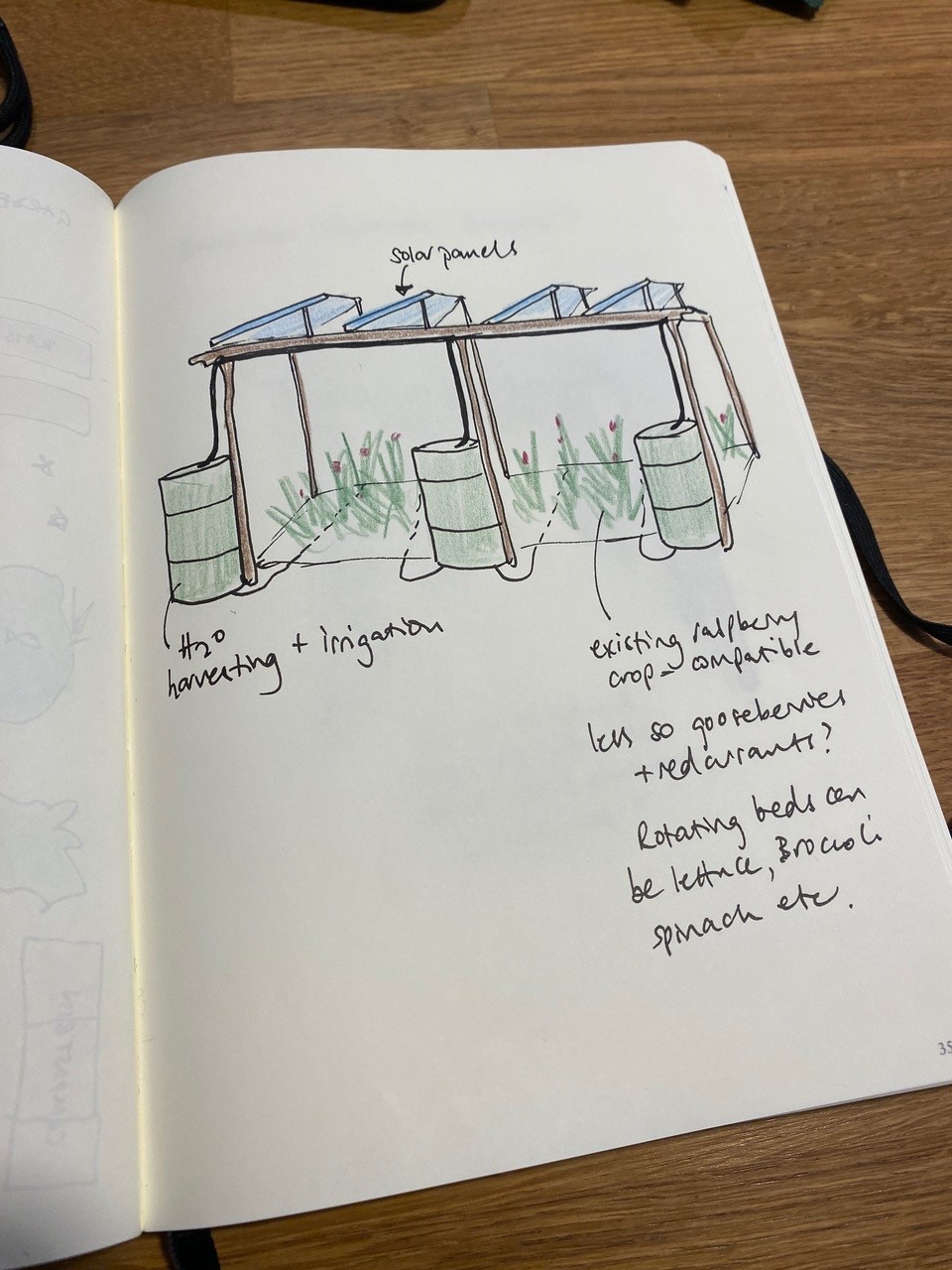 To support the growing area further, we incorporated a rainwater harvesting and irrigation system. A discreet gutter collects runoff from the underside of the panels and feeds it into a water butt, which supplies a drip irrigation line through the beds. This provides automated watering using collected rainwater, reducing maintenance while making the installation both energy-efficient and horticulturally helpful.